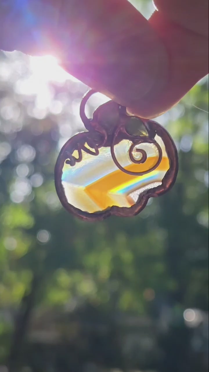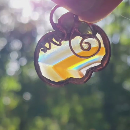 Celebrate autumn with this playful Iris Agate Pumpkin and Peridot Leaf Necklace. A charming iris agate pumpkin shines with a gentle rainbow iridescence, while a bright peridot gemstone leaf adds a fresh pop of green. Copper wire vines swirl whimsically around the pendant, perfect for Halloween or everyday fall fun. This cute necklace captures the magic of the season in a delightful, wearable design. Pendant comes with a custom length copper-plated chain.