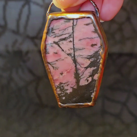Tap into your spooky side with this Rhodonite Coffin Necklace. This witchy statement piece features a coffin-shaped Rhodonite pendant set in warm electroformed copper, blending dark elegance with enchanting vibes. Perfect for Halloween or anytime you want to channel your inner magic, it adds a captivating touch to any look. Pendant comes with a custom length copper-plated chain.